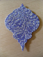 If you peel off the top covering on the sticky sheet you can then lay your chosen piece of lace over the shape and gently tap it down so there are no wrinkles. Scatter the glitter over the shape and spread to cover all exposed areas, tap down gently to make sure all is firmly stuck. Return excess glitter to its pot.