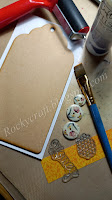 I hunted high and low for some mustard colour paint I thought I had.....no luck, it's somewhere here I think! So I chose a suitable paper as my base layer, this was stuck to the tag with a good PVA glue, brayered flat and left to dry. Once dry I used an emery board to go around the edges and sand them off.